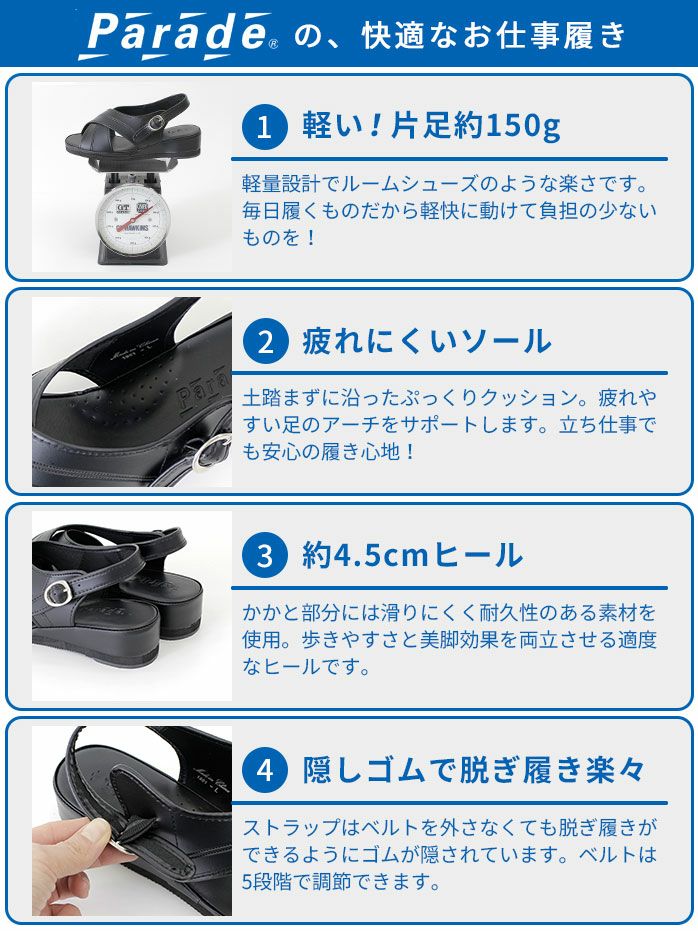 足の裏にやさしくフィットするオフィスサンダル。 オフィスサンダル 黒 ナースサンダル 厚底 疲れにくい レディース サンダル ブラック ベルト ストラップ Parade パレード 991102 991103 他の画像を見る オフィスサンダル 黒 ナースサンダル 厚底 疲れにくい レディース サンダル ブラック ベルト ストラップ Parade パレード 991102 991103 販売価格 ¥ 3,850 税込 お気に入りに登録する ポイント10倍
